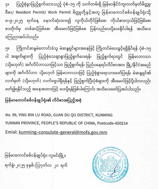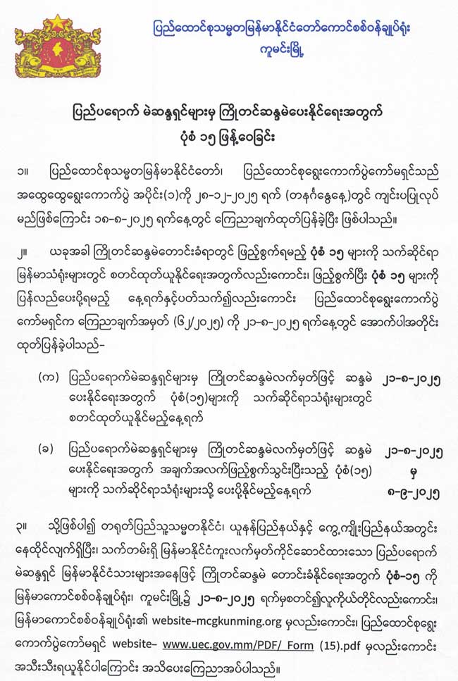 ပြည်ပရောက် မဲဆန္ဒရှင်များ ကြိုတင်ဆန္ဒမဲလက်မှတ်ဖြင့် ဆန္ဒမဲပေးနိုင်ရေးအတွက် ပုံစံ(၁၅) ဖြန့်ဝေခြင်း Download PDF Union Election Commission ပြည်ပရောက် မဲဆန္ဒရှင်များ ကြိုတင်ဆန္ဒမဲလက်မှတ်ဖြင့် ဆန္ဒမဲပေးနိုင်ရေးအတွက် ပုံစံ(၁၅) ဖြန့်ဝေခြင်း ၂၀၂၀ ပြည့်နှစ် အထွေထွေရွေးကောက်ပွဲတွင် စိစစ်တွေ့ရှိရသည့် 'မဲမသမာမှုနှင့် တရားမဲ့ပြုကျင့်မှုများ' ကို Website နှင့် Mobile Application တို့တွင် လေ့လာဖတ်ရှုနိုင်ပြီ MOFA Press Release RSS Error: WP HTTP Error: cURL error 7: Failed to connect to www.mofa.gov.mm port 443 after 275 ms: Could not connect to server အဂတိလိုက်စားမှုများ တိုင်ကြားရန် Embassy Websites Embassy WebsitesBelgiumAustraliaPakistanIndiaSouth AfricaItalySouth KoreaJapanVietnamUnited States of America (Washington)SingaporeUnited States of America (UN)SwitzerlandHong KongSri LankaSaudi ArabiaLaosKuwaitBrunei DarussalamEgyptThailand Government Websites Ministry WebsitesPresident office (Myanmar)Ministry of informationPyithu HluttawMinistry of Trade & e-commYangon City Development CommitteeMinistry of Industry 1Ministry of Industry 2The Ministry Of Religious AffairsMinistry of Foreign AffairsMinistry of CommerceMinistry of Livestock-FisheriesMinistry of ConstructionMinistry of Agriculature and IrrigationMinistry of Co-OperativesMinistry of Hotels and TourismMinistry of Home AffairsMinistry of Educationministry of HealthMyanma Posts and Telecommunications(MPT)Ministry of TransportMinistry of Social welfare, Relief & Resettlement (Department of Social Welfare)Ministry of Science and TechnologyMinistry of LabourMinistry of EnergyMon GovernmentMinistry of Rail TransportationUnion Civil Service BoardMinistry of National Planning and Economic DevelopmentThird Bimstec ( Bay of Bengal Initiative for Multi-Sectoral Technical and Economic Cooperation ) Summit Exchange Rate Kyat Exchange Rate
